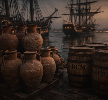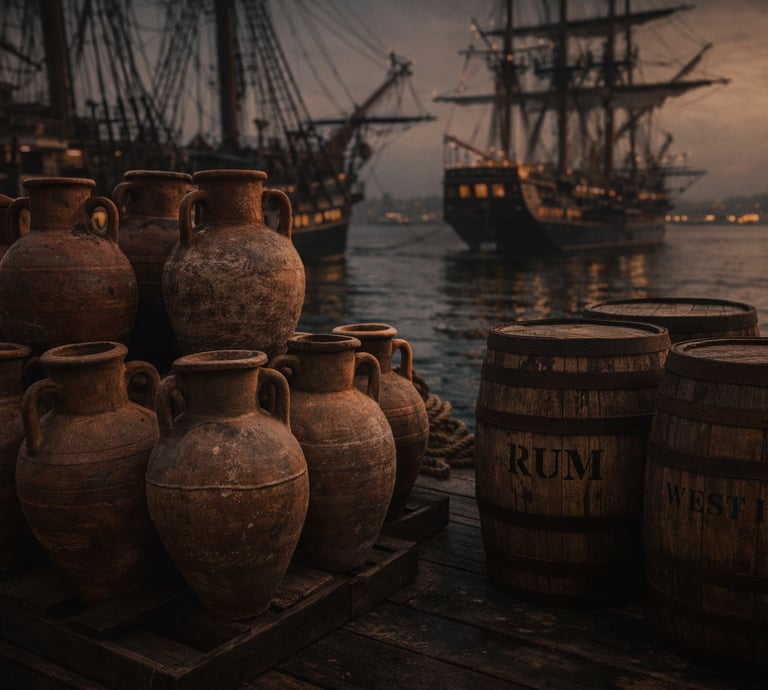 Wine and beer traveled along trade routes. Amphorae transported wine across the Mediterranean. Later, rum would move through colonial trade systems.