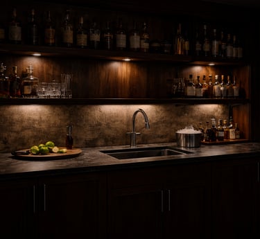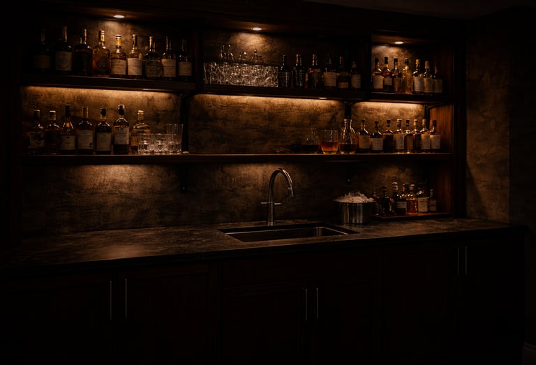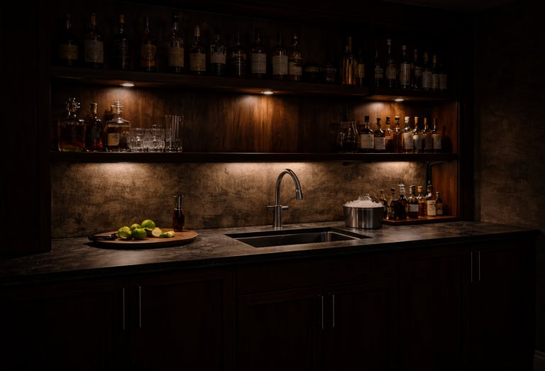 A professional home bar uses layered lighting.