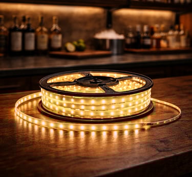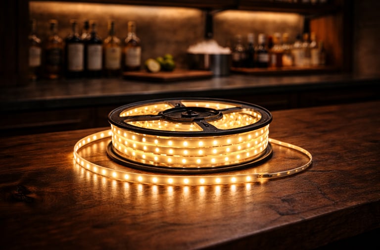 Designed for integrated backlit shelving, toe-kick illumination, and zoned dimming control within permanent home bar builds.