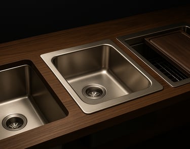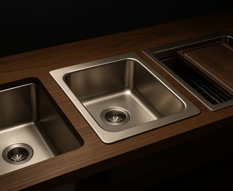 These are installed under the countertop, so the edge of the counter isn’t exposed. That makes cleanup easier—no rim to catch spills. Installing them needs precise cuts and strong mounting with clips and proper silicone. Stone or solid surface countertops hold up best here. I’ve replaced too many undermounts that were poorly sealed; it’s the sealant that fails over time, not the sink.