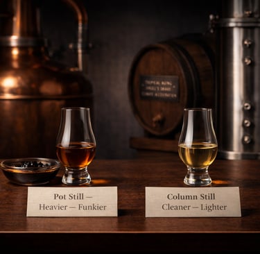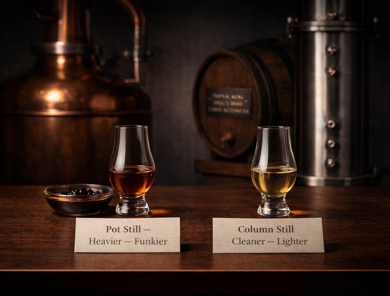 Pot still → heavier, funkier