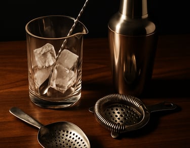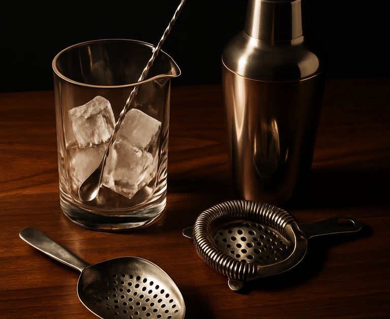 Using the right tools—mixing glass and bar spoon for stirring; shaker and strainer for shaking—makes all the difference